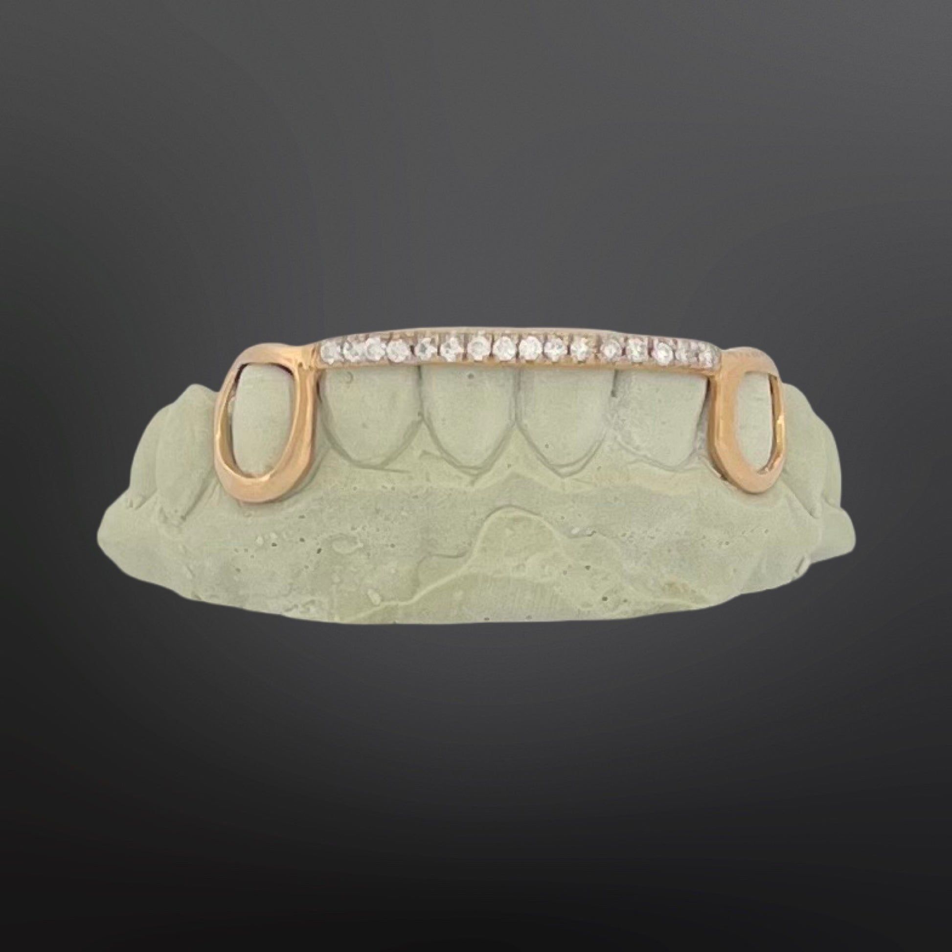 Iced Out Bar And Open Face Fangs Six Teeth Bottom Set Silver Yellow