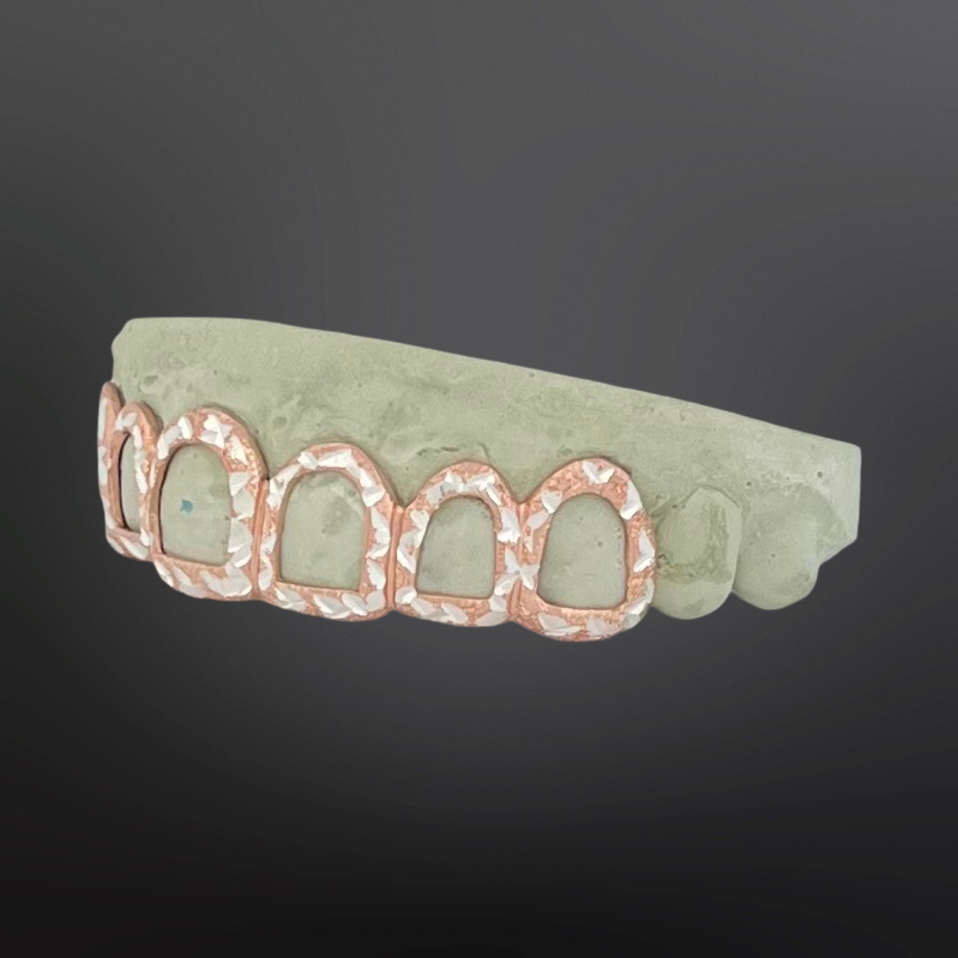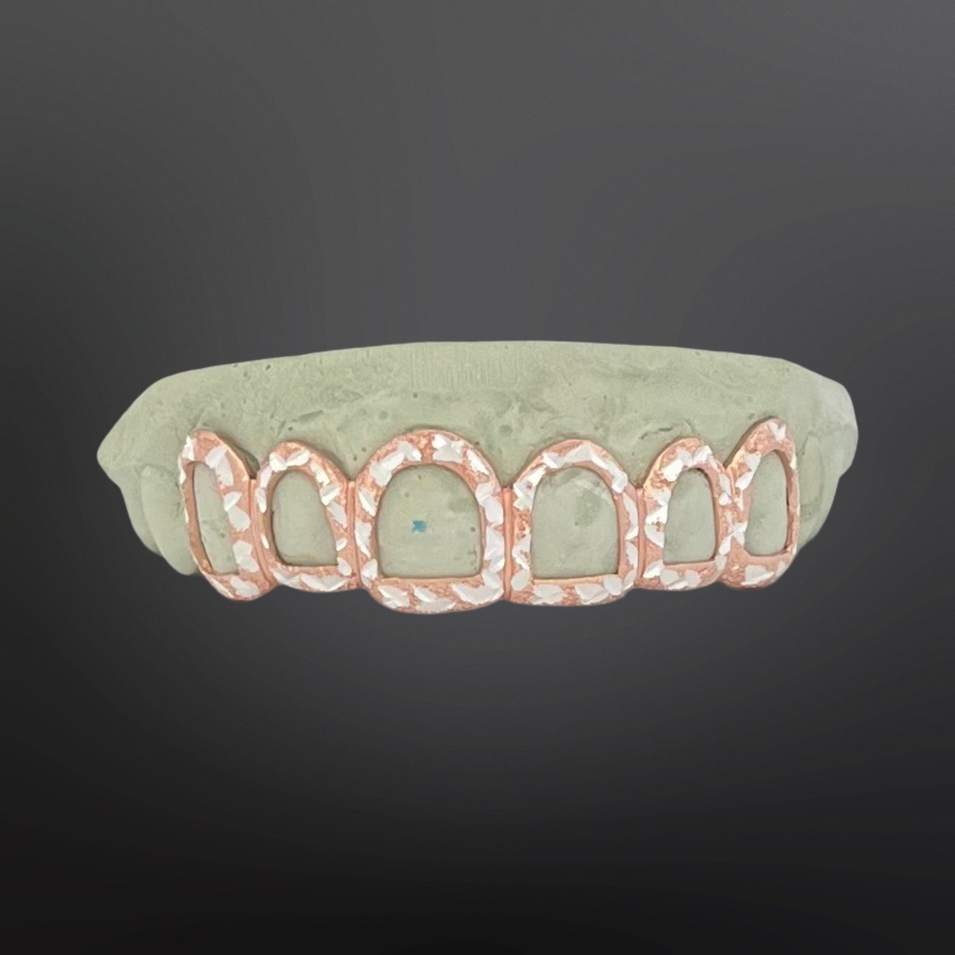 Two Tone Rose Open Face With Diamond Dust And White Diamond Cuts Six Teeth Top Set Silver